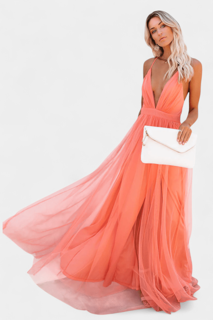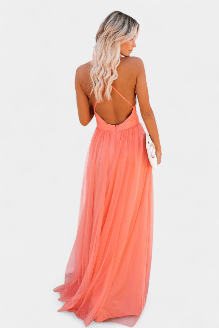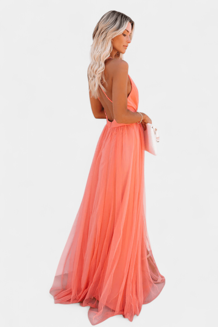 With its sunlit apricot tone, floaty layers, and delicate cross-back straps, this dress is perfect for making a memorable entrance at weddings, sunset celebrations, or any special occasion.