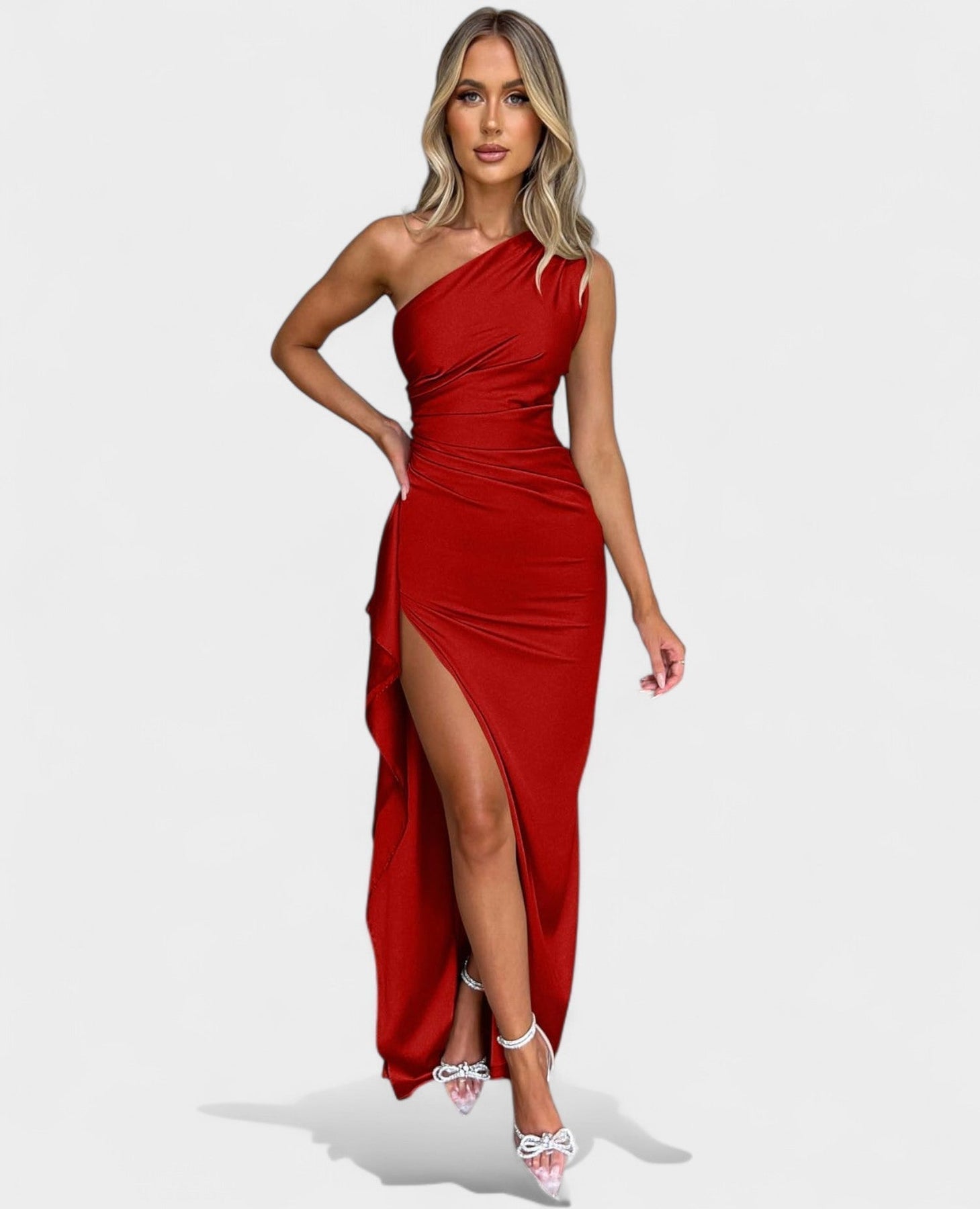 Turn every entrance into a moment with this one-shoulder maxi dress, designed for weddings, cocktail parties, or elegant evenings out. With draped detailing, a floor-sweeping skirt, and a daring side slit, it balances timeless elegance with modern allure.