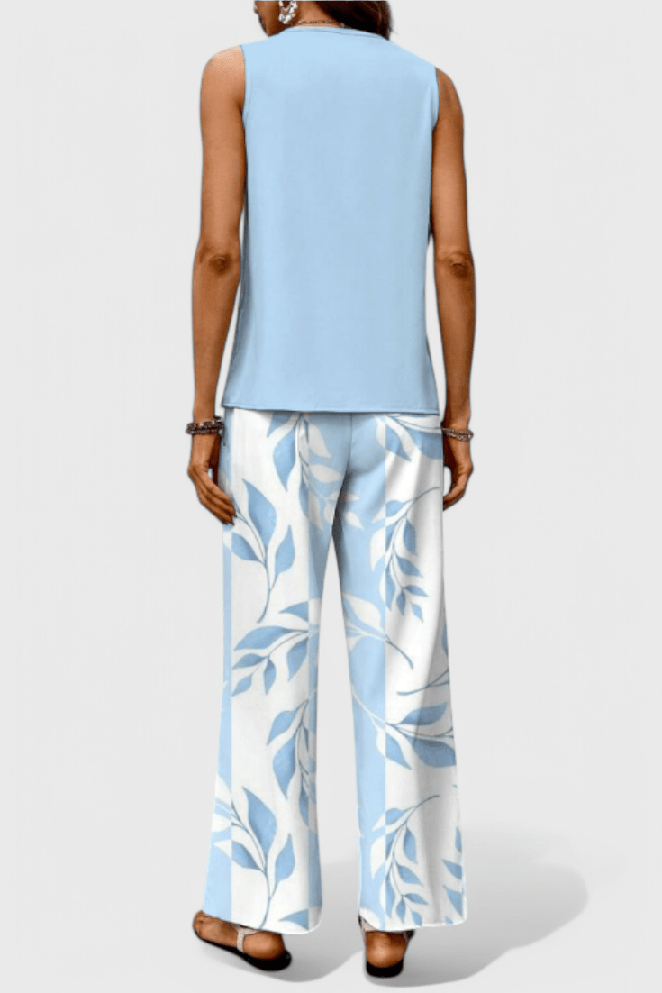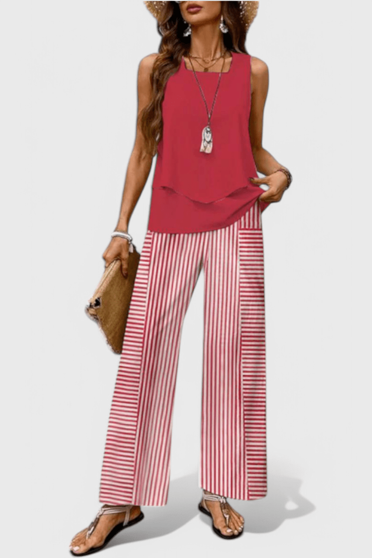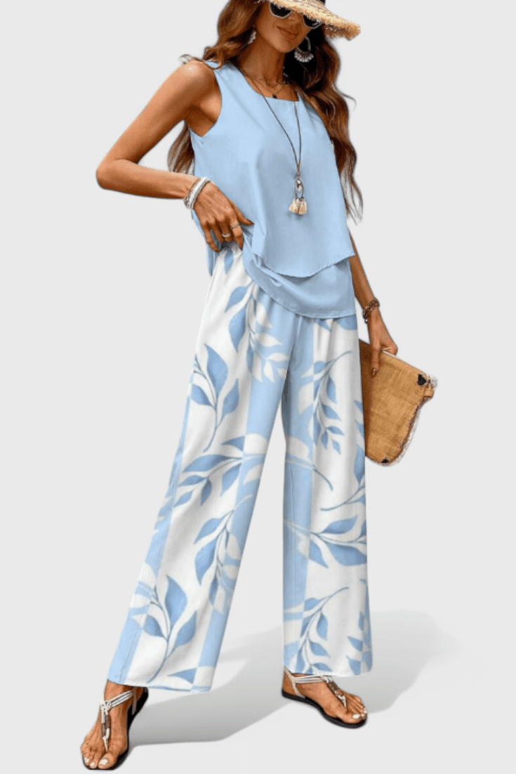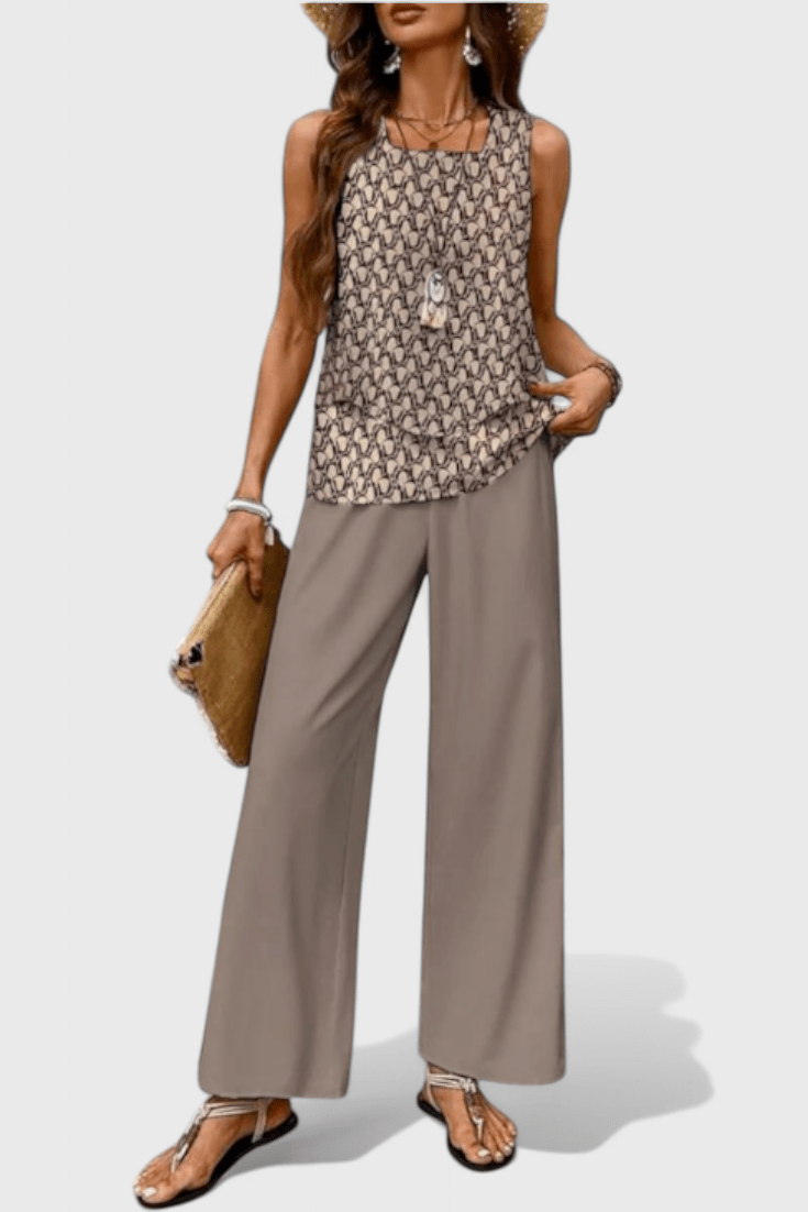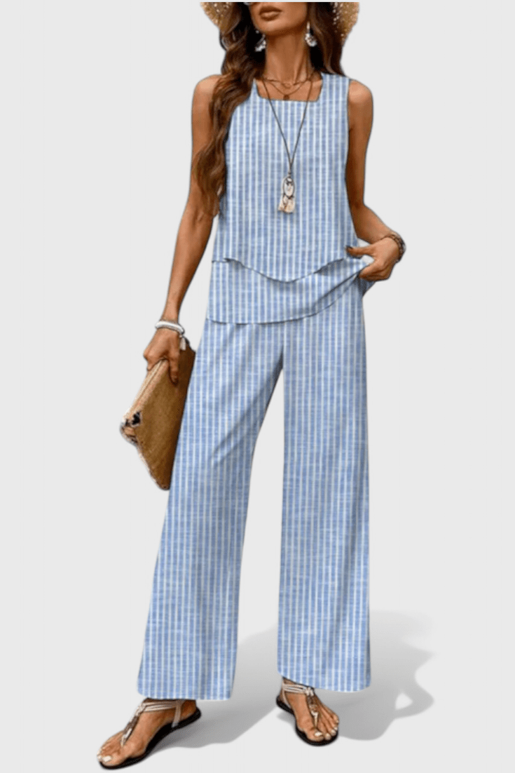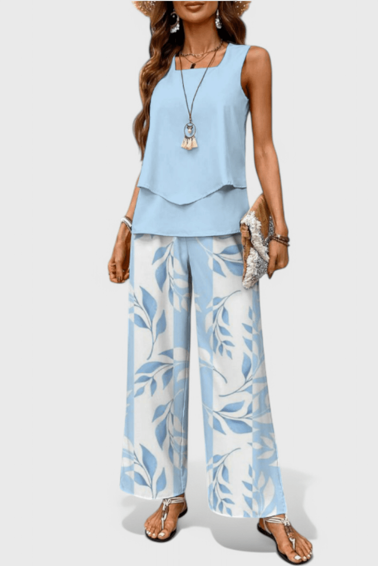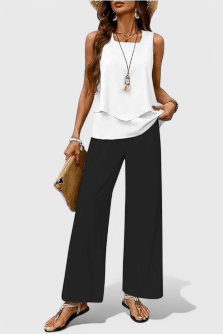 Effortless and modern, the Una Set features a sleeveless layered top with a square neckline, paired with flowing wide-leg trousers. The relaxed fit and clean lines make it a go-to for understated elegance—easy to wear, easy to style, and perfect for warm days with a polished finish.